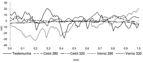 Figure 1 shows the roughness profile of the control and the samples treated with three coats of varnish and cetol for each type of sandpaper.
