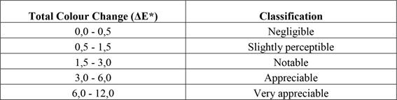 ΔE*- Total colour change between treatmentsΔL*- Variation of luminosity between treatmentsΔa*- Variation of the chromatic coordinatesΔb*- Variation of the chromatic coordinatesTable 2 was used to classify the colour change based on the levels of visual perception, as proposed by Hikita et al. (2001).