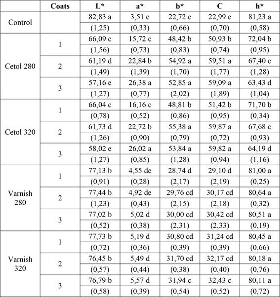 According to Camargos and Gonçalez (2001), wood is considered dark if the L* value is less than or equal to 56. The increase in the red pigmentation represented by a* coordinate also helps to explain the wood darkening after applying the finish, especially for the cetol. The increase in the a* parameter mainly after 3 coats of the product was notable, and was less noticeable after applying the varnish. The h* parameter confirmed the increase of a*, with the decrease of its values showing the colour approximation in the a* green-red coordinate axis, as can be seen for the cetol.