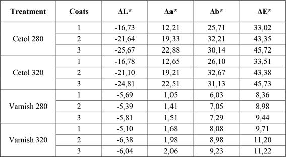 It was feasible to observe that the marupa darkened after applying the products, but this darkening was more intense after applying three cetol coats and the 280-grit sandpaper was used, as indicated by ΔL* equal to -25,67 when compared to ΔL* of - 6,04 after applying three coats of varnish and using the 320-grit sandpaper. The yellowish and reddish pigmentations became more intense, especially after the cetol, according to the positive values of Δa* and Δb*. The total colour variation ΔE* was higher after applying cetol. In observing Table 2, the total colour variation was classified as very appreciable after applying the two products, as suggested by Hikita et al. (2001). Sanding with different grit sizes did not significantly alter the surface colour.