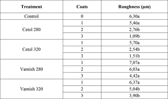 It was observed that the first coat of the finishing product did not affect the sample roughness in all treatments, except the treatment with varnish and 280-grit sandpaper, thus not presenting a statistically significant difference between the control and the first coat.