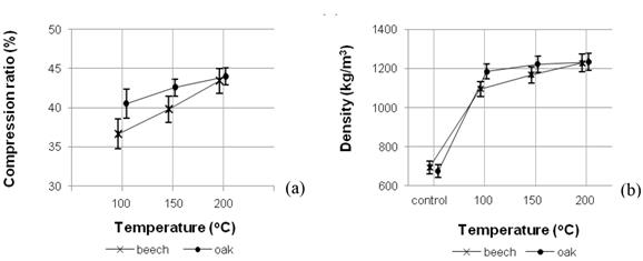 The density of non-densified beech wood was 695 kg/m3 (±32 kg/m3), whereas in the case of oak wood it was 675 kg/m3 (±42 kg/m3). This value was comparable to values cited in previous literature. According to Wagenführ (2007), beech wood (Fagus sylvatica) density in an air-dry condition ranges from 540 kg/m3 to 910 kg/m3, with the mean value 720 kg/m3. Whereas oak wood (Quercus robur) density in an air-dry condition ranges from 430 kg/m3 to 960 kg/m3, with the mean value 690 kg/m3. The density of beech and oak increased as higher temperatures of treatment were applied (Figure 1b). The density of beech wood densified at temperatures of 100°C, 150°C and 200°C was, respectively 60%, 70% and 80% higher than the density of non-densified beech wood. Whereas the density of densified oak wood was 80% higher than the density of oak wood before modification, irrespective of the temperature of densification. This correlation may be caused by the greater softening of wood at a higher temperature (Salmén 1982, Fang et al. 2011, Tu et al. 2014). Alén et al. (2002) noted that upon the temperature exceeding 100°C, the intermolecular and intramolecular chemical bonds begin to break. Whereas Jiang et al. (2009) noted that upon the temperature reaching 160°C, lignin molecules separate from one another, their positions change and the adhesive linkage of lignin with cellulose fibrils is destroyed.