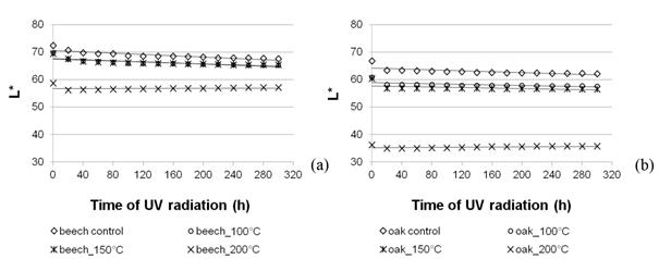 Light irradiation had the greatest effect on the change in the lightness of unmodified wood, and the smallest effect on the lightness of wood densified at a temperature of 200°C. This correlation concerned both beech and oak wood. The lightness of non-densified wood, modified at temperatures of 100°C and 150°C after 300 h of light irradiation, was ca. 7% lower than the lightness of wood before light irradiation and the differences were statistically significant (p<0,05). Whereas the lightness of wood modified at a temperature of 200°C after 300 h of light irradiation did not change significantly. These correlations were an effect of transformations of wood components in the course of thermo-mechanical treatment. Beech and oak wood modified at a higher temperature had a darker colour and, consequently, was less susceptible to a change in colour under the influence of light irradiation.