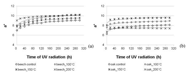 Wood exposed to light irradiation showed another direction of change in the value of a*. Wood densified at a higher temperature was less susceptible to a change in the value of a* under the influence of light irradiation (Figure 3). These correlations are an effect of the transformation of extractives in the course of thermo-mechanical treatment. Hill (2006) notes that the production of condensable fractions occurs with loss of water and volatile extractives at temperatures below about 140°C. The studies conducted show that the smaller the share of extractives in wood, the lower its susceptibility to a change in colour towards red. These correlations are confirmed by the studies conducted by Tolvaj et al. (2014), concerning the influence of ultraviolet radiation on the colour of thermally modified wood. The studies conducted by Mitsui et al. (2001) show that light irradiation resulted in a small redness increase in dry condition, but the wet thermal treatment created an eight times greater redness increase. The greatest change in the value of a* (30% increase) was observed for non-densified beech and oak wood. After 300 h of light irradiation, the value of a* for beech wood densified at temperatures of 100°C, 150°C and 200°C was, respectively, 27%, 22% and 13% higher than before light irradiation. The value of a* for oak wood densified at temperatures of 100°C, 150°C and 200°C was, respectively, 21%, 19% and 11% higher than before light irradiation. After light irradiation, smaller differences in the value of a* could be observed in beech wood than in oak wood. Beech and oak wood showed tendency to become redder due to the reduction of a tonality component in colour and increasing colour saturation C* (Table 3), with the correlations between the values of C* and a* and the values of h and a* being greater for the oak wood.