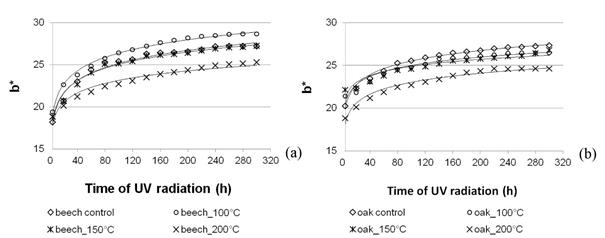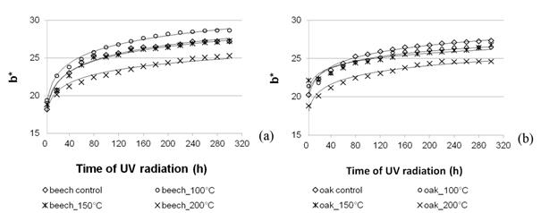 Beech wood densified at a higher temperature was less susceptible to a change in the value of b* under the influence of light irradiation. The greatest changes in the value of b* under the influence of light irradiation (50% increase) were observed for non-densified beech wood. After 300 h of light irradiation, the value of b* for beech wood densified at temperatures of 100°C, 150°C and 200°C was, respectively, 48%, 45% and 34% higher than before light irradiation. No clear correlation was found, however, between the influence of light irradiation and the value of b* for densified oak wood. After 300 h of light irradiation, the value of b* for densified oak wood was from 21% to 31% higher than before light irradiation. The values of b* describe a trend in the change in the colour of beech and oak wood towards yellow, caused by an increased colour saturation (Figure 8). The photochemistry of structural wood components should be seen as a cause of the change in the tonality of the wood colour to yellow. The factors accountable for wood becoming yellow include primarily lignin and its derivatives, i.e. quinones and stilbenes (Nimz 1973, Hon and Glasser 1979, Yazaki et al. 1994). Persze and Tolvaj (2012) also noted that lignin derivatives are accountable mainly for the process of wood yellowing. Chromophore groups in wood can be found primarily in lignin, extractives and their derivatives. As the temperature of treatment rises, the amount of hemicelluloses that undergo degradation increases and, consequently, the lignin content in wood and the susceptibility of wood to a change in colour towards yellow also increase. Yellowing is the main change in the colour of wood being an effect of lignin photodegradation (Hill 2006, Huang et al. 2012, Persze and Tolvaj 2012).