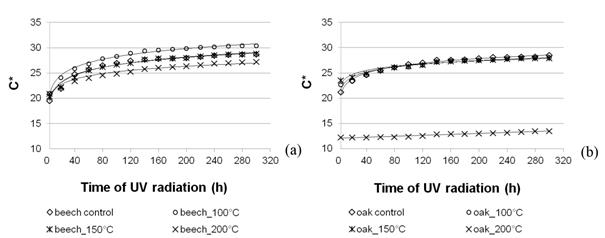 The value of C* for non-densified beech and oak wood was respectively 19,49 (±0,44) and 21,20 (±0,48). After thermo-mechanical treatment, the value of C* for beech wood did not change significantly (p>0,05) and was ca. 20 (Figure 6). The value of C* for oak wood after thermo-mechanical treatment ranged from ca. 12 (for oak modified at a temperature of 200°C) to ca. 24 (for oak modified at temperatures of 100°C and 150°C). Greater dynamics of changes in C* under the influence of light irradiation were found in beech wood. An increase in C* after 300 h of light irradiation ranged from ca. 30% to 47%. Whereas in the case of oak wood, an increase in the value of C* ranging from 10% to 35% was found after 300 h of light irradiation. The lower the temperature of modification, the least susceptible beech and oak wood was to a change in the value of C* under the influence of light irradiation.