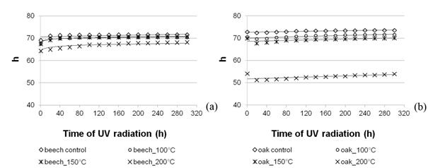 The non-densified beech and oak wood had similar values of h (ca. 70). After thermo-mechanical treatment, the value of h for beech wood and oak wood densified at a temperature of 200°C changed significantly. The influence of thermo-mechanical treatment on the h parameter of the wood colour has been confirmed in literature. Bekhta et al. (2014a) stated that the h values decreased with rising temperature for pine, beech, alder and birch veneer. After 300 h of light irradiation of non-densified and densified beech wood, only a 4% increase in the value of h was recorded as compared with wood before light irradiation. The differences were statistically significant (p<0,05). Light irradiation did not cause significant changes in the value of h of non-densified and densified oak wood (Figure 7).