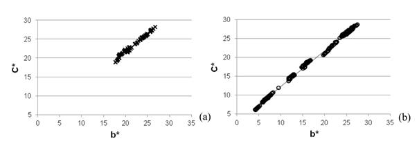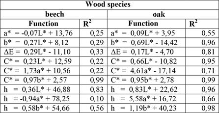 The correlations among the colour parameters of the beech wood were not very pronounced. The R2 values show that a change in colour parameters is much more pronounced for oak than beech wood. The best linear correlation was found between C* and b* for beech as well as oak wood (R2=0,99). This correlation shows significant changes in the value of b* as a result of changes in C* under the influence of the light irradiation of wood (Figure 8). Similar correlations were found by Bekhta et al. (2014b). A good linear correlation was found between h and L* (R2=0,83 for beech, R2=0,96 for oak). Tolvaj and Mitsui (2010) found a good linear correlation between hue angle and lightness of light irradiated wood (the coefficients of determination are between 0,70 and 0,96). On that basis the authors concluded that the measurement of wood lightness was sufficient for estimating colour changes during photodegradation of wood. A poor linear correlation was found between h and b* (R2=0,56). In the case of oak wood, a poor linear correlation was found only between a* and L* as well as between h and a* (the values of R2 were 0,55 and 0,66 respectively).