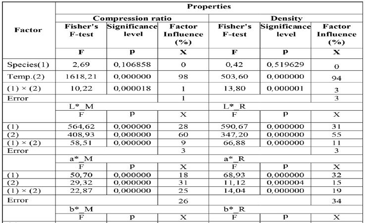 The statistical analysis of the results was performed using the STATISTICA Version-12 software of StatSoft, Inc. (Tulsa, USA). The significance of the influence of the wood species and the temperature of thermo-mechanical treatment on the degree of wood compression (CR), density, colour parameters (L*, a*, b*, C*, h) and the change in colour (ΔE) was determined. It was specified to what extent the wood species and the temperature of treatment affected the wood colour parameters immediately after the modification (parameters with the symbol M, e.g. L*_M) and after 300 h of light irradiation of the wood (parameters with the symbol R, e.g. L*_R). Also the influence of the wood species and the temperature of treatment on the colour change ΔE after 20 h and 300 h of light irradiation was analysed (marked, respectively as ΔE_20R and ΔE_300R). The statistical analysis of the results was performed at a significance level of 0,05. In the case of analysed parameters of wood colour the trend lines were determined and the parameters of the equation of curve (y) as well as the coefficient of determination R2 were provided.