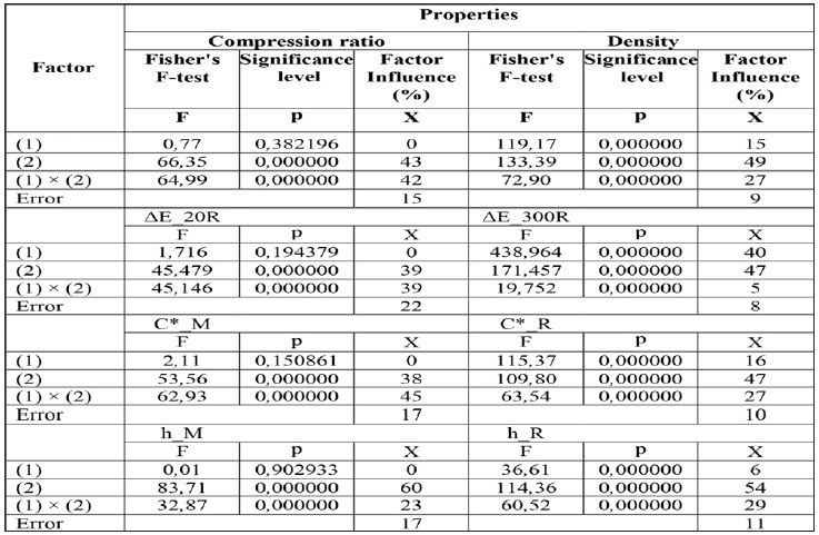 The statistical evaluation of the influence of factors (based on ANOVA, Fischer's F-test) on the parameters of densified wood was shown in Table 1. The wood species demonstrated a significant influence only on the values of L* and a* of the wood after modification. Whereas after 300 h of light irradiation, the wood species demonstrated an influence on all the colour parameters and ΔE (p<0,05). The temperature of thermo-mechanical treatment had a significant influence on CR, density, and all the colour parameters determined immediately after the modification of the wood and after 300 h of light irradiation. The temperature of treatment demonstrated also a significant influence on the total colour change ΔE after 20 h and 300 h of light irradiation (p<0,05). It should be noted that the interaction between the wood species and the temperature of treatment showed a significant influence on all the wood properties under study, in particular on b*, C*, h (influence at the level of 30-40%). When analysing the percentage impact of factors on the properties of the densified beech and oak wood, it is worth noting that there were considerable differences in the influence of these factors. The temperature of treatment influenced the parameters of the modified wood to a greater extent than the wood species. It should be noted that the temperature of treatment showed the greatest influence on CR and the density of wood (98% and 94% respectively). In the case of colour parameters, the temperature of treatment showed the greatest influence on L* and h (influence at the level of 54-60%), and the least significant on a* (15-31%). Significant differences in b*, C*, h, and also ΔE, depending on the species of the wood, were found after 300 h of light irradiation, with no such correlation being found after the wood was modified. The temperature of modification and the interaction between the wood species and the temperature of treatment were more significant. This shows that the susceptibility of beech and oak wood to photodegradation is different.