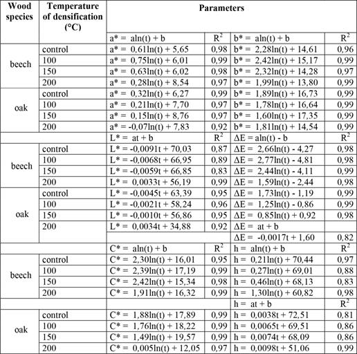 The equations showing the correlations between the wood colour parameters and the values of the coefficient of determination R2 were shown in Table 2. The high values of R2, close to “1”, indicate the usefulness of the regression equation for anticipating the value of the dependent variable L*, a*, b*, C*, h and ΔE using the independent variable t, which is the wood light irradiation time. Regression equations of colour parameters for beech and oak wood densified throughout the range of temperatures and light irradiated is presented in Table 3.