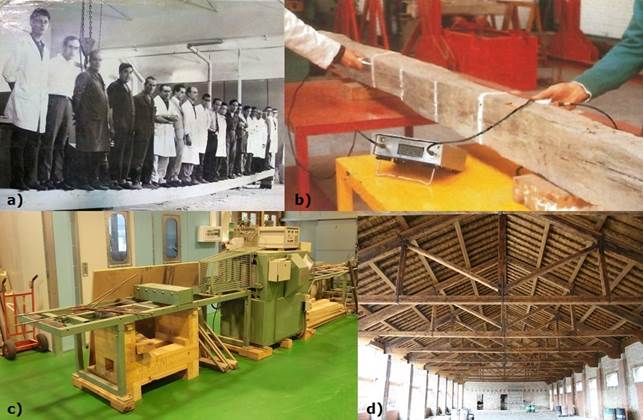 Scientific research into the determination of timber mechanical properties began in Spain in the 1960s, in the INIA Structural Timber Laboratory (Figure 1a). Arriaga et al. (1992) published the first scientific research work using Nondestructive Testing (NDT) on timber in Spain. The Steinkamp BP-V (BPV), a portable ultrasound device with exponential tip 50 kHz sensors, was used on 34 pieces from existing structures to estimate their mechanical properties with determination coefficients (R2) between the modulus of elasticity (MOE) and the dynamic modulus of elasticity (Edyn) of 37 % (Figure 1b). Martínez (1992) used the same NDT device on structural maritime pine timber (40 mm x 100 mm and 50 mm x 150 mm) in his PhD thesis. Bucur et al. (1993) presented the first SCI JCR publication in Spain of NDT on timber using the BPV and X-ray for fungal decay detection in pine and European beech. Several other works were presented with a focus on detecting decay and defects using ultrasound waves (Palaia et al. 1993, Galvañ et al. 1994, Martín 1994, Troya and Navarrete 1994). Rodríguez-Liñán and Rubio (1995) and Rubio (1997) estimated MOE and bending strength (MOR) of new Scots pine timber, timber from existing structures and small clear specimens using the BPV with a R2 from 36 % to 44 % for MOE and MOR, respectively. Pedras et al. (1997) estimated MOE from velocity, with a R2 of 81 % in small clear sweet chestnut specimens. Palaia et al. (2000) proposed models for density (ρ) estimation from needle penetration resistance (NPR) depth using the Pilodyn with a R2 of 80 % using small clear specimens of Scots, maritime and Caribbean pitch pine. Riesco (2001) used BPV velocity to estimate the MOE of small clear specimens of European oak with a 40 % R2. At the end of the 1990s an automatic bending classification machine, the Cook Bolinders (SG-AF Tecmach Ltd., St. Albans, UK), arrived in the INIA Structural Timber Laboratory (Figure 1c). Hermoso (2001) reported the settings used to classify Spanish Scots pine with this machine, and Conde (2003) presented the settings for Salzmann pine. Furthermore, both doctoral theses also estimated structural timber MOE and MOR from ultrasound wave velocity using the Sylvatest (Syl) portable device combined with visual grading parameters.