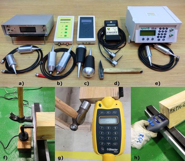 Ultrasound and stress wave time-of-flight (ToF) is recorded. The most common devices are: (1) The Steinkamp BP-V (Ultratest, Achim, Germany) ultrasound device (600 V output power) equipped with 50 kHz exponential tip sensors (Figure 2a), (2) The Sylvatest Duo (220-250 V output power) and the Trio (CBS-CBT, Lausanne, Switzerland) instrument equipped with conical 22 kHz sensors (Figure 2b, Figure 2c), (3) The USLab (Agricef, Campinas, Brazil) ultrasound device (700 V output power and 0,1 μs resolution) which can be used with different sensors from 20 to 90 kHz (Figure 2e), (4) The MicroSecond Timer (Fakopp, Sopron, Hungary) an impact stress wave device (Figure 2d). Velocity is calculated by dividing length over ToF.