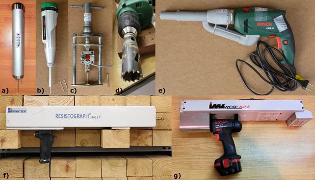 The most common probing devices used in Spain for density estimation and structural inspections found in the literature review are: (1) The Pilodyn 6 J Forest (Proceq, Schwerzenbach, Switzerland) (Figure 3a). This consists of a calibrated spring that releases a 2,5 mm diameter steel needle with a constant energy of 6 J. NPR depth of this needle into the timber is measured in mm. (2) The Wood Pecker (DRC, Ancona, Italy) (Figure 3b). This modified sclerometer inserts a 2,5 mm diameter steel needle by striking several times with constant energy. NPR depth is measured in mm after each strike. (3) The Screw Withdrawal Resistance Meter SWRM (Fakopp, Sopron, Hungary) (Figure 3c). SWR force is measured in kN when a standard screw is pulled out. (4) Commercial core bits with different external diameters, usually from 10 to 22 mm (Figure 3d). The mass and volume of the cylindrical extracted core are measured. (5) The RML Wood Extractor (RML WoodEx) (GICM-UPM, Madrid, Spain) coupled to a commercial drill (Figure 3e). This Spanish design was patented in 2013 (Martínez and Bobadilla 2013) using drilling chips extraction technique. A bit is drilled to a standard depth in wood specimens (so the hollow volume is known) vacuum collecting all of the chips produced during drilling in a paper filter bag. Density is estimated from the mass of chips and volume of the hollow. (6) The Resistograph (RinnTech, Heidelberg, Germany) is a drilling resistance tool where relative resistance is measured against the introduction of a small diameter drill at a constant speed (Figure 3f). (7) The IML Resi (IML, Wiesloch, Germany) uses drilling resistance technique in a similar way to the Resistograph. There are several models, and Figure 3g shows the F400-S. Probing measurements should be taken while avoiding areas close to the pith and other singularities such as knots and resin pockets, etc.