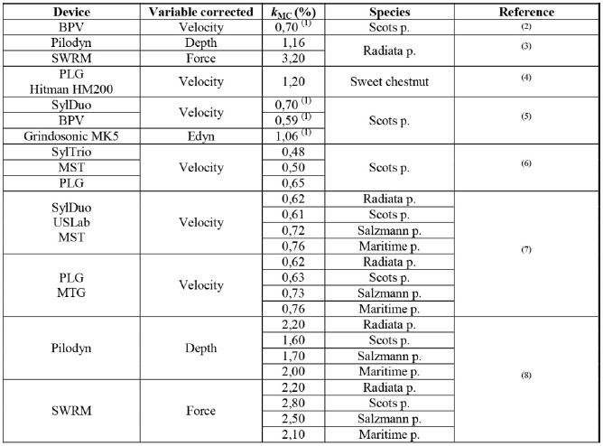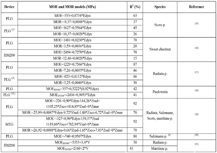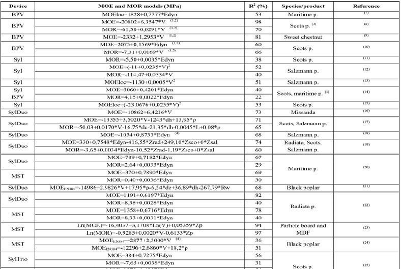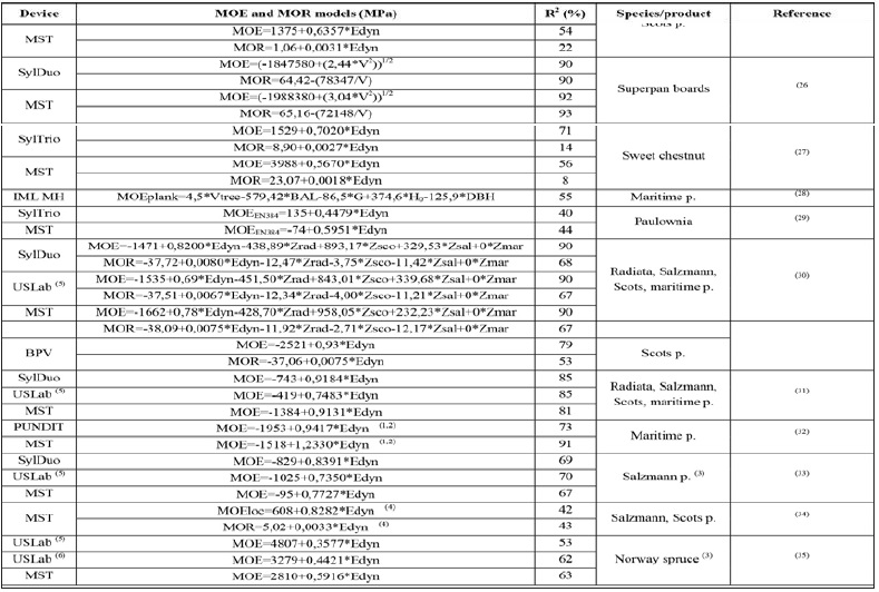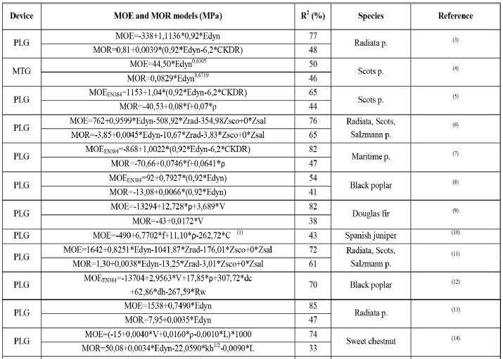 The results obtained are very variable because the methods used are not exactly the same (size of the pieces, wood free of defects vs. structural size timber and the arrangement of measuring equipment, etc.). It is therefore difficult to extrapolate the use of a model for general application. It is very important that in the future different research groups use unified procedures (MC adjustment factors, number of measurements and the way to carry out them) to enhance the capacity of these techniques.