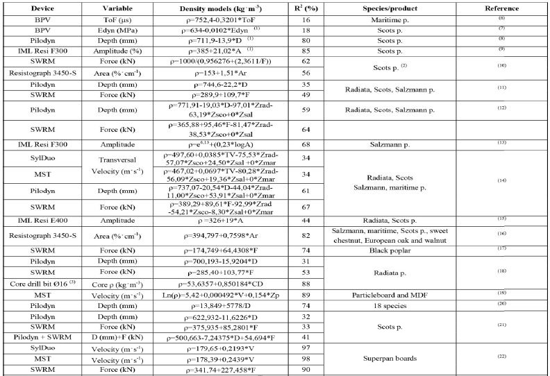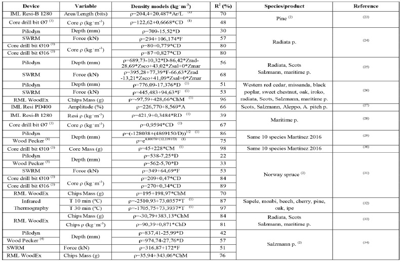 According to several authors (Bobadilla et al. 2007, Íñiguez-González 2007, Calderón 2012, Martínez 2016) no significant differences were found between radial and tangential measurements (with respect to annual rings). Furthermore, in the assessment of timber structures (the most common use for probing techniques) it is not usually possible to select the probing direction. Density estimation models using acoustic and probing techniques have been presented by several Spanish authors (Table 3).