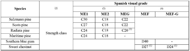 In order to add a new species to the visual grading standard it has to be characterized. Several research works in Spain during the past 30 years focused on this characterization. Fernández-Golfín et al. (1998) summarized the works done in the INIA Structural Timber Laboratory during several years for the characterization of radiata, Scots and maritime pine that led to the production of the first version of the INIA-CIFOR 56544 (1997) standard with two visual grades (ME-1, ME-2). Fernández-Golfín et al. (2001) published the works involved in adding Salzmann pine in the same standard. The results from Íñiguez-González et al. (2007b) made it possible to introduce the new visual grade MEG in the UNE 56544 (2007) for large cross-section timber (thickness > 70 mm). Fernández-Golfín et al. (2007) characterized southern blue gum for the first version of the hardwoods visual standard UNE 56546 (2007). Correal et al. (2013) and Vega et al. (2013) proposed visual grading criteria for structural sweet chestnut that were included in UNE 56546 (2013). Preliminary characterization works were also performed for other species that were not included in standards, such as Spanish juniper (Díez et al. 2006). Furthermore, five Spanish species appear in the EN 1912 (2012), and another one has been approved (Table 5). The latest allocations in EN 1912 (2012) were approved according to the works of Vega et al. (2013) and Hermoso et al. (2016). A new revision of the Spanish visual grading standards would be recommendable following the works of Montón et al. (2015), Llana et al. (2019) and the new version of European standard EN 14081:1 (2016). Several research studies were published comparing visual grading according to the Spanish standard UNE 56544 and the German standard DIN 4074-1, (Díez et al. 2000, Conde 2003, Arriaga et al. 2005b, Adell et al. 2008, Llana et al. 2019). In general, more pieces are rejected using the Spanish standard based on knot evaluation. A research work into the load carrying capacity of timber pieces from existing structures (Arriaga et al. 2005b) proposed a visual grading procedure limited to the main parameters (knots and slope of grain) in an attempt to simplify and adapt the procedure used in new timber to in-situ grading particularities. Other works studied the practically zero influence of some defects, such as fissures and wanes, on mechanical properties (Arriaga et al. 2007, Esteban et al. 2010). Touza et al. (2013) proposed a new visual grading criterion for large cross-section American pitch pine specimens from existing structures, based on knots, grain slope and boring insect attacks. Arriaga et al. (2017b) showed that visual grading standards (designed for new sawn timber) lead to a high percentage of rejection in existing timber structures, and it is usually not possible to access all 4 faces. Furthermore, beam cross-section is not homogeneous (Osuna-Sequera et al. 2017). Vega et al. (2019a) found ineffective visual strength grading of 216 dry sweet chestnut small-diameter logs using EN 1927-1 (2008), EN 1927-2 (2008) and DIN 4074-2 (1958) standards.