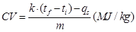 k is calorimeter constant (the calorimeter heat capacity), expressed in MJ/°C; tf, ti - the final and initial temperature, in °C; m - mass of sample, in g; qs- heat released by cotton and nickel thread in MJ/kg.