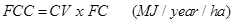 (9)Where: FCC-forest calorific capacity, in MJ/year/ha; CV-calorific value of oven dry wooden specie, in MJ/kg; FC-forestry capacity, in t/ha· year.