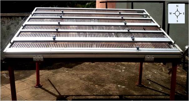 The injection moulded samples (tensile and flexural test samples) were exposed to outdoor conditions on the roof-top of the laboratory building. The specimens were fixed on a custom-made aluminium rack (Figure 1). The rack was oriented in North-South direction to get maximum sunlight on the samples. Only one side of the sample was exposed to weathering. A set of five specimens were removed from the exposure rack after 2, 4, 8 and 12 months of outdoor weathering and analyzed for colour changes and mechanical properties. This exposure and removal schedule allowed for property evaluation across seasons.