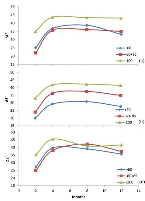 The total colour change (ΔE*) of the composite is shown in Figure 2. The trend of total colour change was like that observed for lightness. Rapid colour change (ΔE*) was observed in the initial four months of the exposure period and thereafter the values were stabilized in almost all the cases. The wood particle size and coupling agents exhibited slight influence in the total colour change of the composites after outdoor weathering of 12 months. Composites prepared with -100 mesh size particles exhibited higher colour change through-out the one year of natural weathering. There was no remarkable difference in colour changes in composites with +60 and -60+85 particle size except in case of m-TMI-g-PP coupling agent (Figure 2b) where the total colour change in composites with +60 mesh size exhibited the lowest colour change and the difference between +60 and -60+85 particles was statistically significant. The composites with large particles (+60 mesh) and with m-TMI-g-PP coupling agent exhibited the least colour change (ΔE* = 28) among all the composites after 12 months of weathering. For all other formulations, total colour change was nearly the same at different periods. It is therefore can be inferred that coupling agent has no significant influence on total colour change of the composites during weathering. The surface colour change is mainly due to chemical and physical changes in both wood and polymer on UV exposure (Matuana et al. 2011). Higher magnitude of colour changes in composites with finer particles (-100) might be attributed to the large surface area of wood with finer particles exposed to weathering.