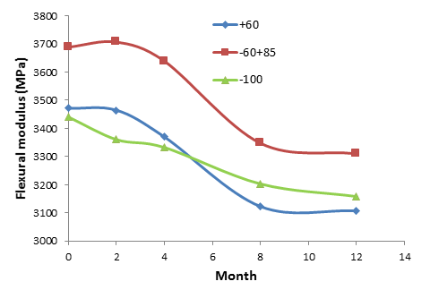 The initial flexural modulus (prior to weathering) was ranging from 3172 MPa to 3844 MPa for different formulations. There was no specific difference in the modulus values with coupling agents. The average modulus for three fibre size classes is shown in Figure 3. The maximum modulus values were observed in the fibre size class -60+85.
