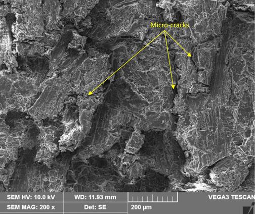 The changes in colour and loss in mechanical properties of the composites due to natural weathering and its dependency on particle size suggests the need to optimize the formulations for outdoor applications. It was observed that, initially, weathering affects the colour of the composites without having any significant influence on the mechanical properties as during the initial period of weathering only surface of the composites is affected. However, with continuous weathering, the surface tends to develop micro cracks (Homkhiew et al. 2014) and the fibres in the inner core get exposed for UV radiation and water resulting in their swelling and degradation. Scanning electron microscopic analysis of weathered sample clearly indicates development of number of micro-cracks on the surface of the sample (marked by the arrow-marks) and also surface erosion after one year of weathering (Figure 4).