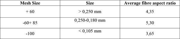 Melia dubia wood billets were chipped and pulverized into flour/powder. The flour was fed into a gyrator screen to segregate the fibres into different particle size classes. Wood fibres passing through BSS standard mesh sizes +60, -60+85 and -100 were collected separately and kept in a hot air oven at 105 °C for 24 hours to remove moisture. The oven dried wood fibres were used for the preparation of the composites. Wood fibres with +60 mesh sizes included all fibres which could not pass through 60 mesh. Similarly, wood fibres of -100 sizes were mix of very fine particles which were less than 0,1 mm in size. The fibre dimensions and the aspect ratio of different fractions are given in Table 1.