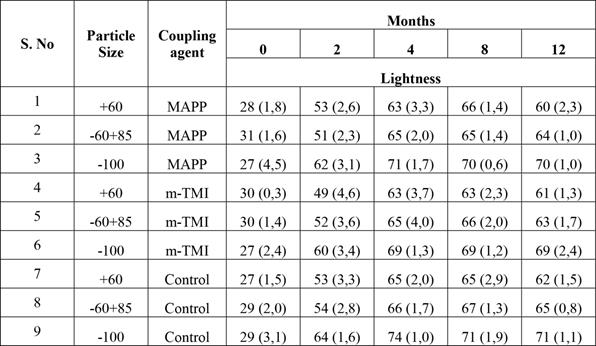 To study the effect of natural weathering on WPC samples; composite compounded with different wood particle sizes and coupling agents at 40 % wood loading. The changes in the colour of the WPC samples from outdoor exposure were recorded in terms of lightness, yellowness and redness. The surface colour was measured after 2, 4, 8 and 12 months of outdoor exposure. The change in lightness of the composites prepared with different wood particle sizes and coupling agents due to weathering is given in Table 2.
