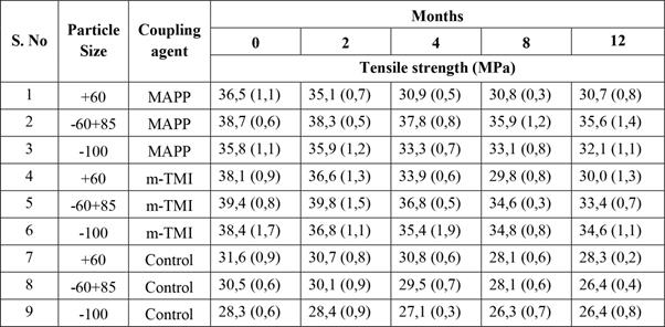 The results clearly indicate that for a specific particle size, the strength properties of the composites with coupling agents were significantly higher than of composites without any coupling agent. Analysis of variance also indicated significant effect of coupling agent on the strength. This is attributed to superior interfacial adhesion between fibre and matrix polymer in the presence of a coupling agent. Between the two coupling agents, properties of the composites with m-TMI-g-PP coupling agent were better than MAPP. The superiority of m-TMI-g-PP over MAPP has already been proved by Chauhan et al. (2016). The effect of particle size on the properties was also very evident where composites prepared with -60+85 mesh size fibre exhibited the best properties for both the coupling agents. The results are in congruence with the results reported by Chauhan et al. (2016). The strength of the composites with coupling agent was relatively unchanged for the initial 2 to 4 months of weathering and thereafter exhibited slight decline. A paired t-test also indicated no significant difference in strength properties of composites in the first four months with respect to strength before weathering. However, the strength values were significantly lower than initial strength after 12 months of weathering. The composites prepared using large particles (i.e. +60 mesh sizes) exhibited relatively more loss in strength compared to other two size classes. Tensile strength reduction after 12 months of weathering was 15,8 %, 21,3 % and 10,4 % for MAPP, m-TMI-g-PP and uncoupled composites, respectively for +60 mesh wood fibre. The loss in mechanical strength may be attributed to the reduced interfacial adhesion with weathering and loosening of the fibres. Retention of mechanical properties with small particle composite can be explained by the fact that small wood particles composites are more homogenous than the composites with large wood fibres.