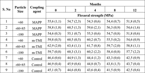 The modulus values remained unaltered for initial four months of weathering and thereafter declined in a similar fashion in both +60 and -60+85 composites. Overall, the flexural modulus reduced by about 10 % with respect to the initial values after one year of weathering. Eshraghi et al. (2016) also observed about 10 % decline in flexural modulus of HDPE-wood composites after 2000 h of artificial weathering. It was observed that the loss in flexural modulus in the composites containing smaller wood particle size (Mesh size -100) was relatively lesser as compared to other two wood particle sizes. The reduction in elastic modulus may be attributed to the loosening of surface fibres due to weathering and their wash-off with exposure to water during rains and also due to increase moisture content of fibres in the composites.