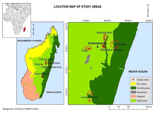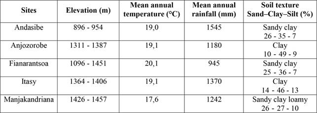 Table 1 lists the characteristics of the study zones according to the environmental factors considered. The study zones differed in terms of elevation, climate and soil texture. Andasibe lies in a humid, lowland region. Anjozorobe, Fianarantsoa, Itasy and Manjakandriana lie in sub-humid highland zones. The highest temperature was encountered at Fianarantsoa and the lowest at Manjakandriana. The soils in the 5 zones are somewhat clay-rich and vary in sand and silt rates.