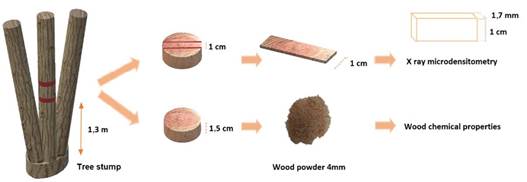 A stem without any apparent defects was cut from each stump. A log was cut from each stem 1,30 m above the stump. Two 1,5-cm disks were cut from each log. A diametral strip measuring 1 cm wide by 1,7 mm thick was made from one of the disks to assess wood density at a 12% moisture content. The second disk was ground to 4 mm to assess chemical properties (Figure 2).