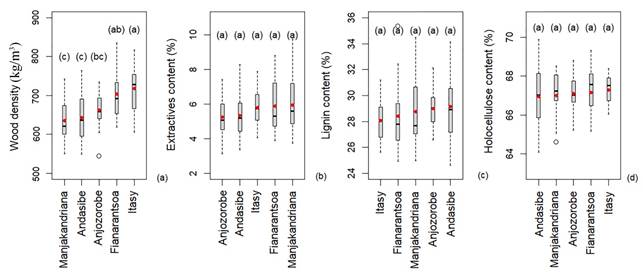 The descriptive data for the 12% density and chemical properties of the wood per study zone are presented in Figure 3.