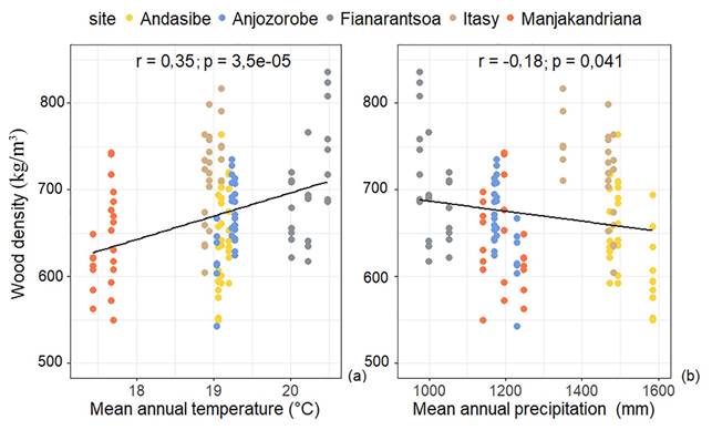 Density varied from 543 to 836 kg/m3 and differed significantly between the regions (p-value<0,001). Two groups stood out, with Manjakandriana, Andasibe and Anjozorobe in the first, and Fianarantsoa and Itasy in the second. Based on the factors characterizing the regions, we found no explanation for the formation of these two groups. For example, the Fianarantsoa region was the driest, while the Itasy region was among the wettest.