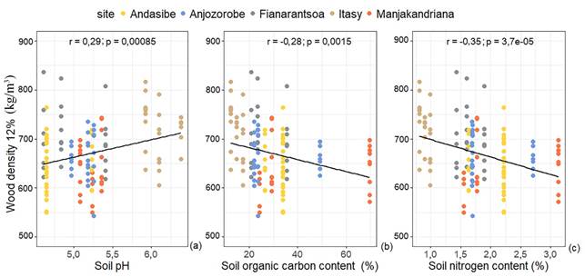 Figure 5 shows the relation between certain soil chemical characteristics (pH, organic carbon and nitrogen) and wood density.