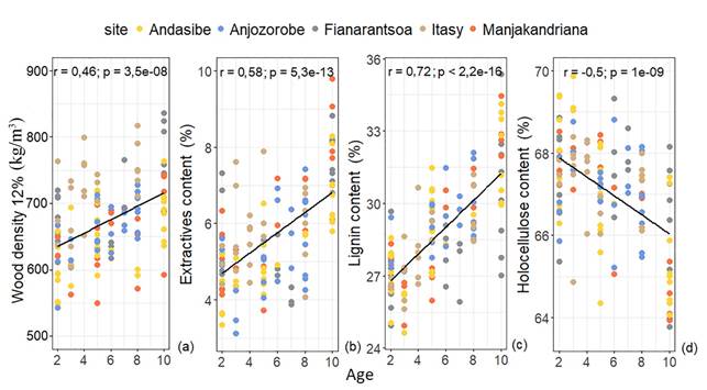 An analysis of the correlations showed that, out of the factors studied, wood age, MAR and MAT, along with soil chemical properties, such as pH, nitrogen and organic carbon contents, were related to wood density. Only wood age was related to both d12 and the EXT, KL and HOLO contents and therefore appeared to be the most important factor. However, the tree density per hectare, elevation and certain soil properties, such as phosphorus content, cation exchange capacity and texture, did not affect wood physico-chemical properties.