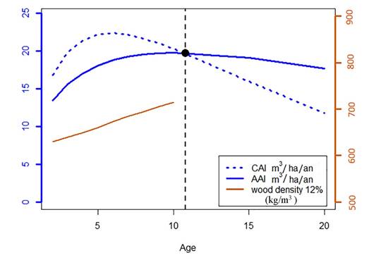 For an average fertility class, the current annual increment curve for the merchantable volume of wood per hectare increased up to 5-6 years, decreasing thereafter. The curve for the average increment in merchantable volume of wood per hectare displayed peaks at around 8-9 years. The two curves crossed over in the 11th year, which therefore corresponds to the optimum cutting age for the volume of wood produced. Considering that wood density increases with age, the proposal to cut at 11 years is coherent. Nevertheless, in order to take into account socio-economic aspects whereby E. robusta wood is in great demand and the owners often have money problems that prevent them from waiting for a long rotation, the average rotation recommended for E. robusta cutting in Madagascar is, in fact, 7 years (Ramamonjisoa 1999). At that age, wood density is around 694 kg/m3.