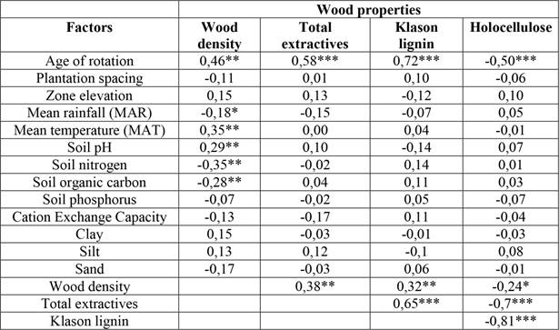 The correlations between silvicultural practices, environmental factors and wood properties are described in Table 2.