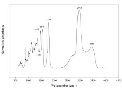 The FTIR spectrum of the gum is given in Figure 1. The peaks at wavenumbers of 3450 cm-1, 2960 cm-1 and 1789 cm-1 are related to the stretching vibration of O-H, C-H, and C=O, respectively. The absorption bands at wavenumbers of 1429 cm-1 and 1472 cm-1 are due to vibration of C-H group. The peak occurred in the wavenumber of 1546 cm-1 is also caused by vibration of N-H and C=N.
