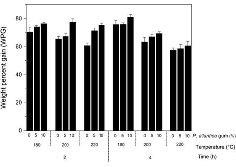 The oil-heat treatment yielded a WPG in the range of 60,7 % to 77,6 % (Figure 2). The WPG after thermal modification in oil was previously reported to be in the range of 50 % to 90 %, depending on the process variables (time and temperature) and wood species (Sailer et al. 2000, Lee et al. 2018). The weight of wood is normally reduced due to thermal degradation of the cell wall polymers; however, the amount of oil uptake during thermal modification with oil is much more than the weight loss caused by the thermal degradation, resulting in the weight gain. The WPG increased by using P. atlantica gum, which was directly proportional to its concentration. In agreement with previous works (Lee et al. 2018), the WPG decreased by increasing the modification temperature from 180 °C to 220 °C when the cooling stage was carried out in the oil without P. atlantica gum. This can be due to further destruction of the wood cell wall compounds at higher temperatures. In contrast, the WPG was greater at higher temperatures when the specimens were cooled in the oil containing 5 % P. atlantica gum. It is believed that the oil is significantly absorbed during the cooling stage of the oil-heat treatment process due to the pressure gradient (Lee et al. 2018).