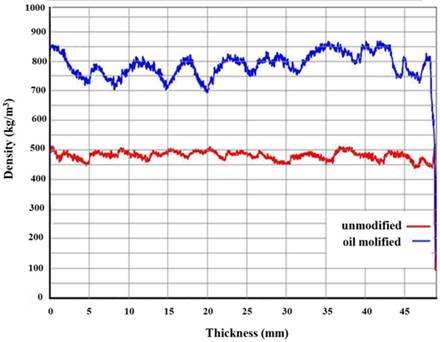 The vertical density profile of the modified wood specimens was measured using a commercial X-ray scanner (Siempelkamp’s Sicoscan, Germany) to determine the uniformity of the modification process. The specimens were prepared with dimensions of 50 mm × 50 mm × 50 mm according to the instruction manual of the device. The measurements were performed by scanning across the thickness in the middle of the specimens.