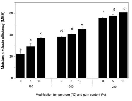 A uniform pattern of density profile for the modified wood specimens (Figure 3) indicates a roughly homogeneous thermal modification and oil uptake through the specimen thickness. As expected, thermal modification reduced the EMC of wood samples (Figure 4). The moisture exclusion efficiency is usually attributed to degradation of the cell wall polymers, reduction in the hydroxyl (OH) accessibility, polycondensation reactions in the lignin, and formation of thermal degradation products which reduce the microporosity of the cell walls (Esteves and Pereira 2009). The efficiency was also improved by using P. atlantica gum.
