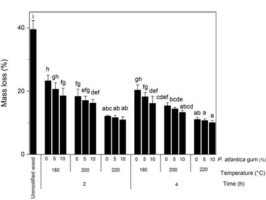 We found that the P. atlantica gum had more pronounced effect on the mold growth of the oil-heat treated wood than the decay resistance. The improvement can be due to the presence of monoterpenes such as α-pinene, β-pinene and α-terpinolene in the P. atlantica essential oil as well as a further increase in the moisture exclusion efficiency of the treated wood. The results of this study also showed that increasing the heat-treatment temperature was more successful than increasing the heat-treatment time to improve the resistance of the oil-heat treated wood to the fungal attacks. Considering the high amount of α-pinene and β-pinene in the P. atlantica essential oil, study on its efficiency for preservation of wood against wood-destroying insects is recommended.