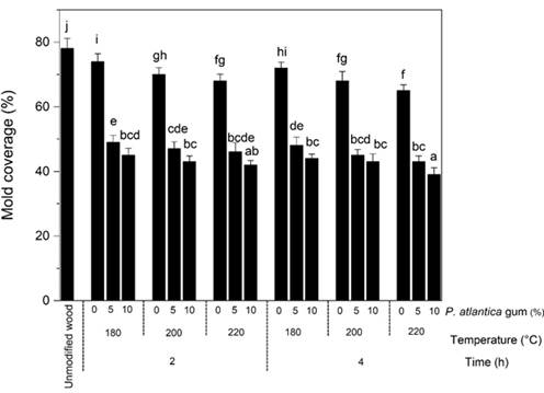 Although the oil heat treatment improved the mold resistance, the modified woods were not completely safe from the mold attack. Unlike decay fungi that feed on the cell wall compounds, molds feed on the stored starches, sugars and proteins, and thus the cell wall alteration caused by thermal modification has little influence on the mold control. Thus, it is recommended to use mold-resistant coatings for protection of thermally modified wood against molds. Boonstra et al. (2007) also found that the heat-treated radiata pine and Norway spruce were susceptible to mold growth due to formation of some thermal degradation products like surges. The addition of P. atlantica gum to the rapeseed oil significantly reduced the mold coverage. All wood specimens treated by using P. atlantica gum with mold coverage of 26 % to 50 % were in class 3. However, the gum could not completely prevent the mold growth. The enhanced mold resistance is due to the antimicrobial properties of the gum, along with the improved moisture exclusion efficiency of the modified wood. Antifungal efficiency of P. atlantica essential oil against Penicillium italicum (Talibi et al. 2012), Aspergillus niger, Aspergillus flavus, Aspergillus fumigatus (Shialy et al. 2015), Rhizopus stolonifer, Trichoderma sp and Fusarium sp (Benhammou et al. 2008) was also previously reported. Bahmani and Schmidt (2018) showed complete growth inhibition of A. niger and P. commune on Pinus taeda wood samples by the oils from Cybopogon winterianus, Lavandula angustifolia and Thymus vulgaris and additionally by Trachsperum copticum oil on Fagus orientalis samples.
