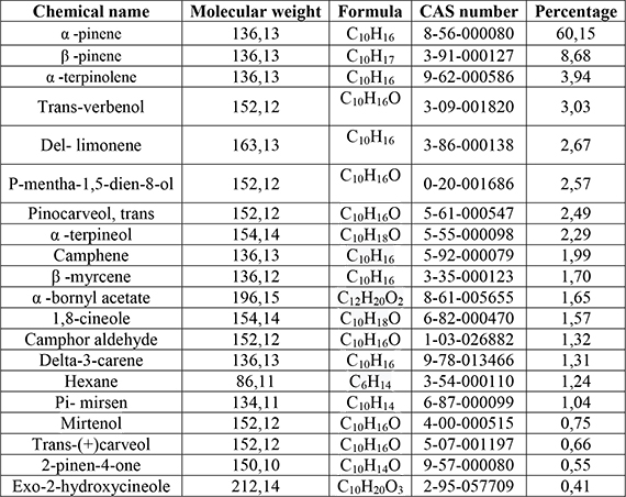 The chemical components of P. atlantica essential oil are shown in Table 1 α-pinene, β-pinene and α-terpinolene were the most constituents of the oil with amount of 60,15 %, 8,68 % and 3,93 %, respectively. The type and amount of chemical compounds of P. atlantica essential oil determined in this study were slightly different with those reported in some previous researches (Alma et al. 2004, Barrero et al. 2005, Salimi et al. 2011). Barrero et al. (2005) identified the α-pinene and β-pinene as the main components of the essential oil with amount of 42,9 % and 13,2 %, respectively. These differences may be due to variation in tree species, sampling time, and growth conditions (Alma et al. 2004).