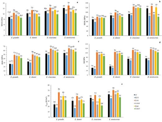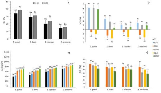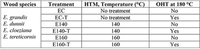 Other studies have shown that the densification at >180 °C carries to a significant reduction of the mechanical properties (Navi and Pizzi 2015, Pelit et al. 2015, Pertuzzatti et al. 2018), whereas when too low temperature are applied, the springback effect is remarkable and a stabilizing post-treatment is required (Dubey et al. 2012). For this reason, in this study, we investigate the technological properties of the wood treated at 140 °C and 160 °C and applying the OHT to find the most suitable treatment for enhancing the properties of the four Eucalyptus species considered (E. grandis, E. dunnii, E. cloeziana and E. tereticornis).