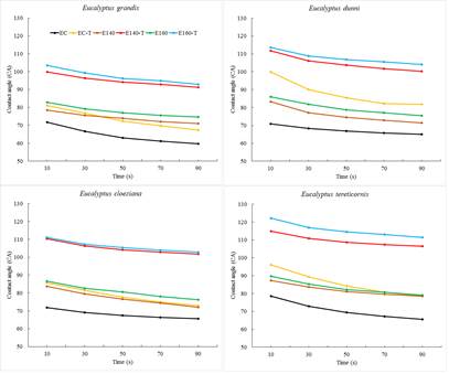 In Figure 3 the contact angle measurements at different time were registered for every treatment and species. The oil treated specimens showed the more hydrophobic behavior with similar contact angles (between 90° and 110°) for E. grandis, E. cloeziana and E. dunnii, while the specimens of E. tereticornis showed slightly higher values (over 120° for the treatment at 160 °C) and this was due to their higher density (Amorim et al. 2013). Specimens densified at higher temperatures, resulted more hydrophobic than the homologues treated at milder temperatures while the samples undergoing only oil treatment presented similar trend than the sample densified but not oil-treated, meaning that the two processes allow similar enhancements. The specimens treated only with oil showed steeper slopes than the HTM densified samples which suggest that the OHT modification involves prolonged hydrophobic behavior. This was possibly due to the smoother surface of the densified samples (Christiansen 1991, Pertuzzatti et al. 2016).