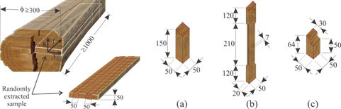 In this work, homogeneous batches were used in all the tests, as it is required by ABNT NBR 7190 (1997). According to the Standard, the batch volume cannot exceed 12 m3, and the specimens should be extracted randomly, limited to one sample per beam, as shown in Figure 1. All wood species were stored and tested at the LaMEM (Laboratório de Madeiras e Estruturas de Madeiras) of the University of São Paulo (USP), following the procedures of Brazilian standard.