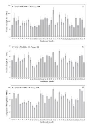 Figure 2 shows the average values, confidence intervals (at the 95 % confidence level), and the ranges (maximum and minimum values) of variance of the coefficient of variation (CV) of the strength properties, ft0 (a), fv0 (b) and fc0 (c) for the 36 investigated hardwoods.